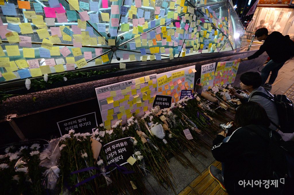 [아시아경제 문호남 수습기자] 강남역 여성 살인 사건 1주기인 17일 서울 강남구 신논현역 6번 출구 앞에서 열린 추모문화제에 참가한 시민들이 강남역 10번 출구 방향으로 행진을 마치고 추모를 하고 있다.문호남 수습기자 munonam@asiae.co.kr<ⓒ세계를 보는 창 경제를 보는 눈, 아시아경제(www.asiae.co.kr) 무단전재 배포금지>