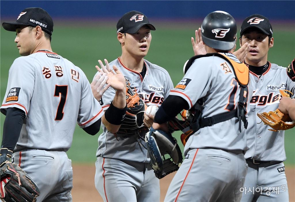 [아시아경제 김현민 기자]프로야구 한화 이글스와 넥센 히어로즈의 2017 KBO리그 경기가 17일 서울 고척돔에서 열렸다. 한화 하주석이 8-4 승리를 확정한 뒤 동료들과 기뻐하고 있다.김현민 기자 kimhyun81@asiae.co.kr<ⓒ세계를 보는 창 경제를 보는 눈, 아시아경제(www.asiae.co.kr) 무단전재 배포금지>