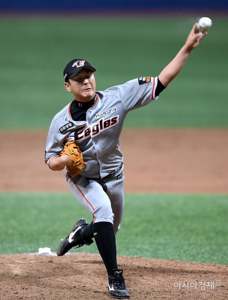 [아시아경제 김현민 기자]프로야구 한화 이글스와 넥센 히어로즈의 2017 KBO리그 경기가 17일 서울 고척돔에서 열렸다. 한화 마무리 정우람이 9회말 역투하고 있다.김현민 기자 kimhyun81@asiae.co.kr<ⓒ세계를 보는 창 경제를 보는 눈, 아시아경제(www.asiae.co.kr) 무단전재 배포금지>