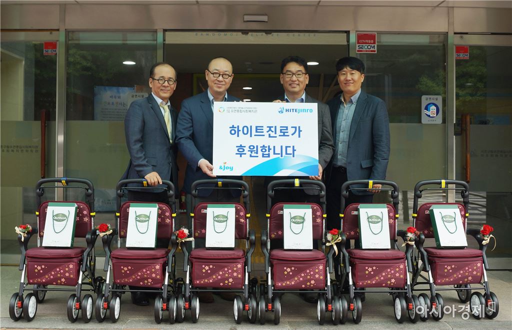 하이트진로가 11일 우면종합사회복지관에서 보행용 유모차를 지원하는 기증식을 갖고 있다.