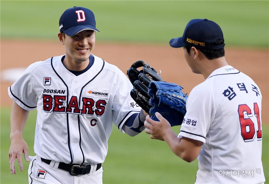 [아시아경제 김현민 기자]프로야구 NC 다이노스와 두산 베어스의 2017 KBO리그 경기가 18일 잠실구장에서 열렸다. 1회초 1사 만루에서 두산 선발 함덕주(오른쪽)가 NC 이호준을 병살 처리한 유격수 김재호와 하이파이브하고 있다. 김현민 기자 kimhyun81@asiae.co.kr<ⓒ세계를 보는 창 경제를 보는 눈, 아시아경제(www.asiae.co.kr) 무단전재 배포금지>