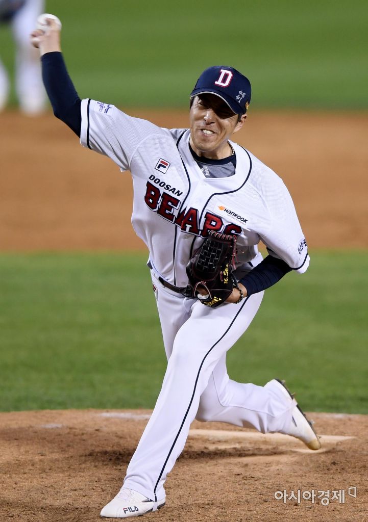 [아시아경제 김현민 기자]프로야구 NC 다이노스와 두산 베어스의 2017 KBO리그 경기가 18일 잠실구장에서 열렸다. 4회초 두산 구원투수 김승회가 역투하고 있다. 김현민 기자 kimhyun81@asiae.co.kr<ⓒ세계를 보는 창 경제를 보는 눈, 아시아경제(www.asiae.co.kr) 무단전재 배포금지>