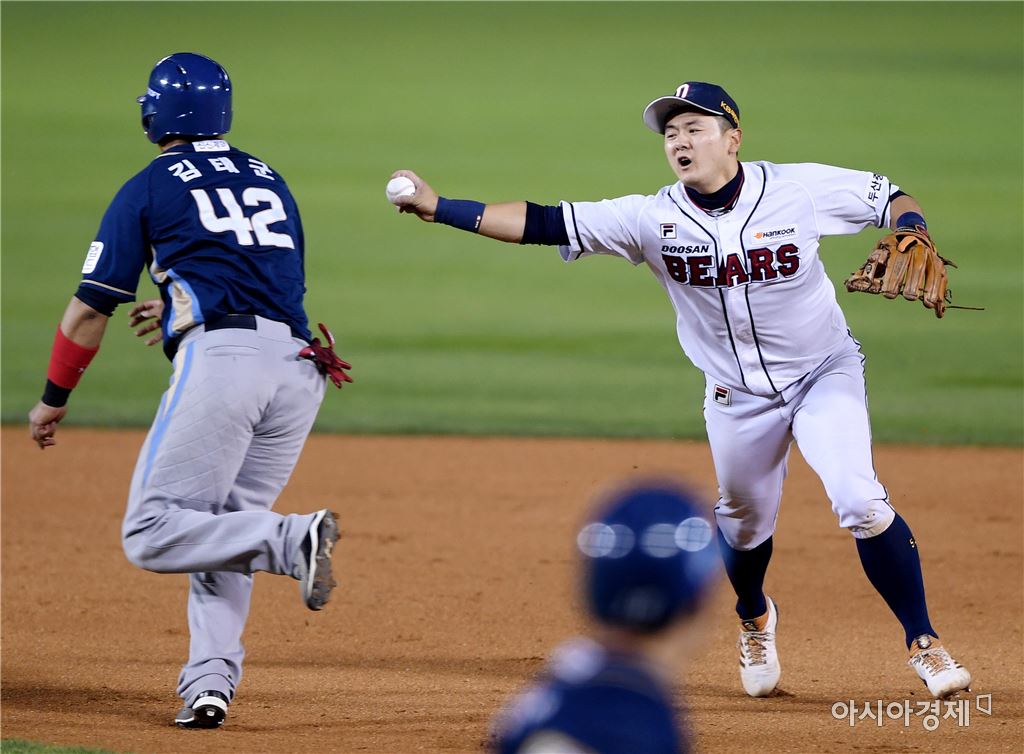 [아시아경제 김현민 기자]프로야구 NC 다이노스와 두산 베어스의 2017 KBO리그 경기가 18일 잠실구장에서 열렸다. 6회초 1사 1루에서 두산 2루수 최주환이 NC 지석훈의 땅볼 타구를 잡아 1루주자 김태군에게 태그를 시도하고 있다. 김현민 기자 kimhyun81@asiae.co.kr<ⓒ세계를 보는 창 경제를 보는 눈, 아시아경제(www.asiae.co.kr) 무단전재 배포금지>