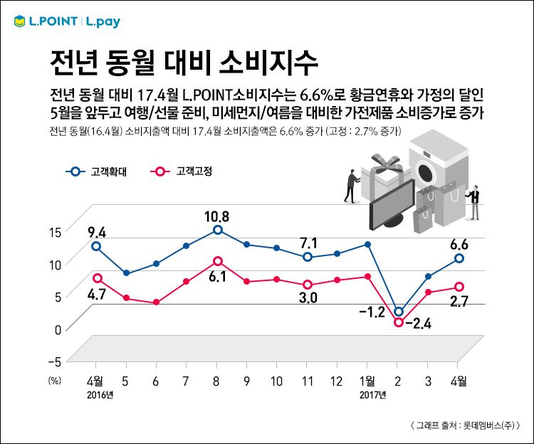 L.POINT 소비지수, 고객군별·유통영역별·상품군별 ‘실질 소비트렌드’ 제공황금연휴와 가정의 달의 영향으로 소비심리 회복세 두드러져미세먼지 및 이른 여름 대비로 유통영역별, 세대별 가전제품 소비지출 급증[아시아경제 오종탁 기자]5월 황금연휴와 황사 및 미세먼지가 꽁꽁 닫힌 소비자들의 지갑을 열게 했다. 가정을 달을 맞아 여행과 선물을 준비하려는 소비자와 건강에 관심이 많은 소비자들의 심리를 움직인 것. 이에 연중 소비심리가 낮은 쇼핑 비수기임에도 불구, 소비지수가 소폭 상승한 것으로 조사됐다. 롯데멤버스는 통합멤버십 브랜드인 엘포인트(L.POINT) 3690만 회원의 소비 트렌드를 측정한 '4월 L.POINT 소비지수를 공개한다고 19일 밝혔다. 지난달 L.POINT 소비지수는 전년 동월 대비 6.6%(고정 2.7%)로 전월에 이어 지속적인 소비 상승세를 보이는 것으로 나타났다. 황금연휴와 가정의 달인 5월을 앞두고 여행과 선물을 미리 준비하려는 소비자들의 심리가 반영된 것으로 분석된다. 전월 대비 소비지수는 1.9%(고정 0.4% 감소) 소폭 상승했다.롯데멤버스는 주목할 만한 점으로 공통적으로 가전제품 소비가 급증했다는 점을 꼽았다. 유통영역별 L.POINT 소비지수는 가전제품 전문판매점, 편의점, 대형마트, 인터넷 쇼핑 순으로 전년 동월 대비 큰 폭으로 증가했다. 중국발 황사나 미세먼지를 대비하기 위한 공기청정기 및 전기건조기에 대한 수요가 급증했고, 미리 여름을 준비하려는 소비자들의 움직임으로 가전제품 전문판매점의 소비가 전년 동월 대비 14.7%(고정 5.0%) 증가했다. 특히 건강에 관심이 높은 50대~60대에 이어 40대 여성의 전년 동월 대비 소비지출 확대가 두드러진 것으로 나타났다. 이러한 가전제품에 대한 수요 증가뿐 아니라 5월 황금연휴에 근거리 여행을 준비하거나 미세먼지로 외출을 취소한 소비자들의 먹거리 수요가 증가하면서 대형마트의 전년 동월 대비 소비지수는 8.1%(고정 4.7%) 증가한 것으로 나타났다. 세대별 L.POINT 소비지수는 밀레니얼 7.1%(고정 1.8%), X세대 7.5%(고정 4.5%), 베이비부머 2.8%(고정 0.7%) 증가했다. 밀레니얼과 X세대를 중심으로 소비 증가가 높게 나타났으며 밀레니얼 세대는 대형마트와 슈퍼마켓에서, X세대는 인터넷 쇼핑에서 전년 대비 소비 증가현상이 두드러지는 것으로 나타났다. 상품군별 소비지수의 경우 최근 유행하는 혼밥ㆍ혼술, 작은사치 소비트렌드가 반영한 것으로 나타났다. 상품군별 전년 동월 대비 L.POINT 소비지수는 가정간편식사를 위한 즉석식품과 냉장식사 소비지수가 각각 33.5%(고정 30.0%), 14.9%(고정 11.4%)로 꾸준한 증가세를 보였고, 맥주는 19.1%(고정 15.1%)로 전월에 이어 지속 상승세를 보이고 있다. '작은 사치' 소비 트렌드의 확대로 프리미엄 케이크 등 고급 디저트에 대한 수요가 높아지면서 고급 디저트(아이스크림) 소비지수가 47.7%(고정 51.9%)로 급상승했다.