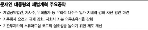 대주주 지배력 약화과정에 단기적 채권투자심리 위축 우려장기적으로는 불확실성 해소로 투자자에 유리[아시아경제 박나영 기자]문재인 정부의 '재벌 개혁을 골자로 한 경제민주화' 정책이 가시화되면서 채권시장이 긴장하고 있다. 개혁 과정에서 일부 기업이 유동성 문제를 겪을 수 있다는 우려가 제기되고 있기 때문이다. 그러나 장기적으로는 채권투자자들에게 긍정적인 영향을 미칠 것이라는 전망이 나온다. 19일 금융투자업계 전문가들은 새 정부의 재벌개혁 정책이 우리나라 기업의 고질적인 문제였던 지배구조 불확실성의 해소를 통해 채권 투자자들에게 유리한 방향으로 전개될 것이라는 전망을 내놓고 있다. 우선 기업의 지배구조 투명성을 제고하기 위한 '대주주 지배력 강화 견제 정책'은 기업이 보다 합리적인 의사결정을 하도록 유도함으로써 궁극적으로 채권시장에 긍정적인 영향을 미칠 것으로 보인다. 김태형 이베스트투자증권 연구원은 "우리나라 기업의 지배구조가 너무 복잡하게 얽혀 있어 특정 기업이 벌어들인 수익이 주주와 채권자에 귀속돼야 하는데 대주주 일가에 유리한 쪽으로 흘러가는 경향이 컸다"며 "까막눈 투자자가 생기는 이유"라고 지적했다. 이어 "단적인 예로 2013년 자금난을 겪던 동양그룹이 동양증권을 통해 부도 직전의 자회사 기업어음과 회사채를 판매했던 동양사태를 들 수 있다"고 덧붙였다.