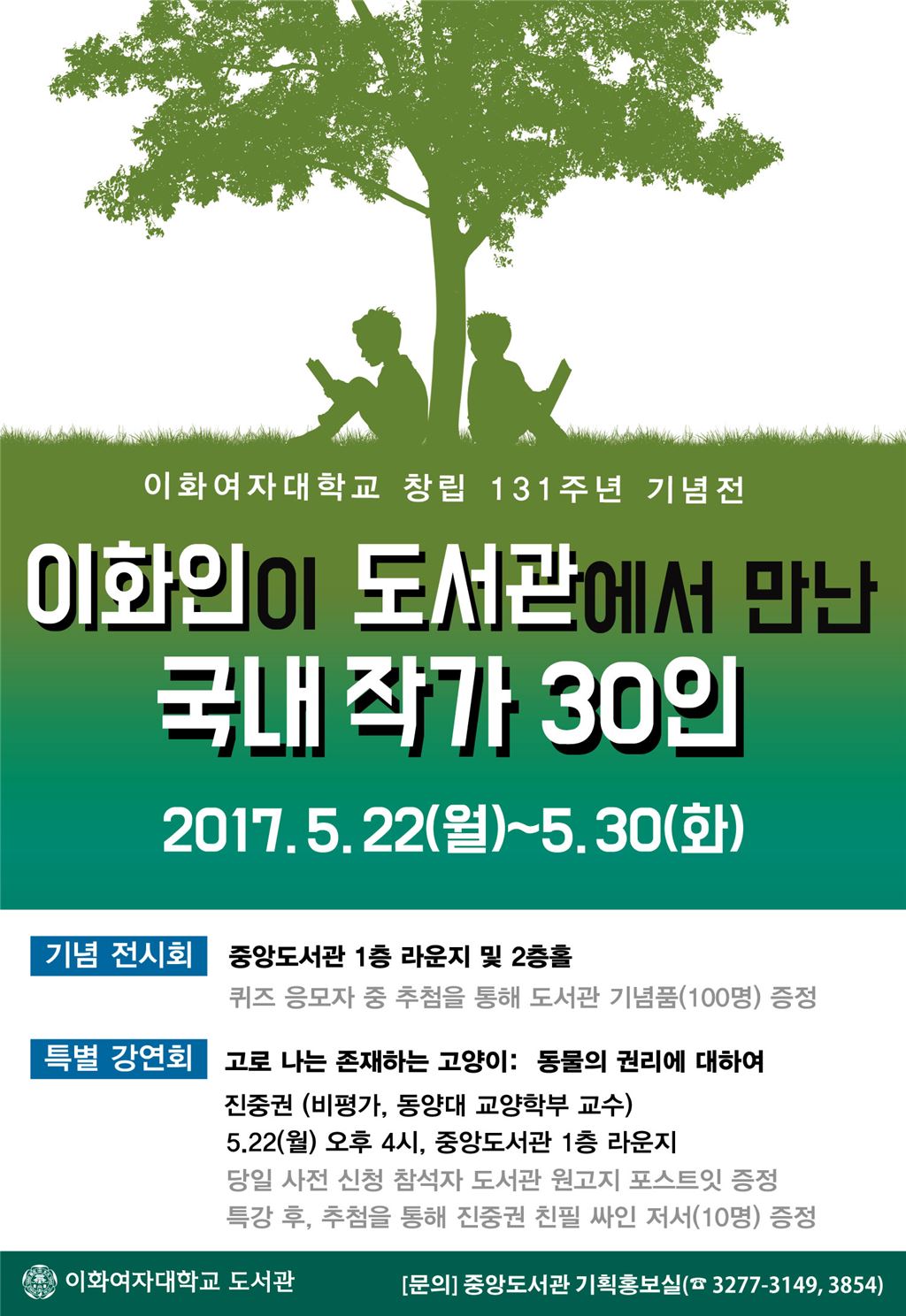 [아시아경제 조인경 기자] 이화여대 중앙도서관이 최근 3년간 재학생 대출도서 현황을 분석한 결과 조정래 작가가 최다 대출 국내작가로 선정됐다고 19일 밝혔다. 조 작가의 대표 작품 '아리랑'과 '정글만리', '태백산맥', '한강', '허수아비춤' 등이 이화여대생 필독서로 자리매김했다는 분석이다.뒤를 이어 '나는 너를 파괴할 권리가 있다', '검은꽃' 등으로 유명한 소설가 김영하, '세계의 끝 여자친구', '원더보이'의 김연수, '엄마를 부탁해', '외딴방'의 신경숙, '사랑 후에 오는 것들', '즐거운 나의 집'의 공지영이 2~5위를 차지했다. 이외에도 박민규, 정이현, 진중권, 김진명, 박경리 작가가 10위 안에 들었고 작가로도 유명한 이화여대 건축학전공 임석재 교수도 27위에 이름을 올렸다. 중앙도서관은 이화여대 창립 131주년을 맞아 오는 22~30일 도서관 1층에서 재학생이 많이 대출한 이들 국내 작가 30인의 작품을 한자리에 모은 도서전을 개최한다. 또 22일 오후 4시에는 대출 순위 8위인 동양대학교 교수 겸 문화비평가 진중권 작가를 초청, '고로 나는 존재하는 고양이: 동물의 권리에 대하여'를 주제로 특별 강연회를 연다.조인경 기자 ikjo@asiae.co.kr<ⓒ세계를 보는 창 경제를 보는 눈, 아시아경제(www.asiae.co.kr) 무단전재 배포금지>