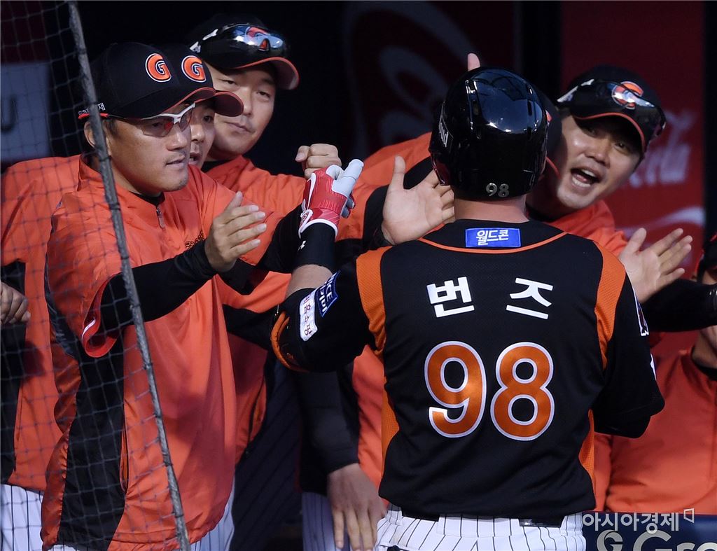 [아시아경제 김현민 기자]프로야구 롯데 자이언츠와 LG 트윈스의 2017 KBO리그 경기가 19일 잠실구장에서 열렸다. 4회초 1사 1,2루에서 롯데 번즈가 LG 선발 허프를 상대로 역전 3점 홈런을 치고 선행주자 최준석과 하이파이브하고 있다. 김현민 기자 kimhyun81@asiae.co.kr<ⓒ세계를 보는 창 경제를 보는 눈, 아시아경제(www.asiae.co.kr) 무단전재 배포금지>