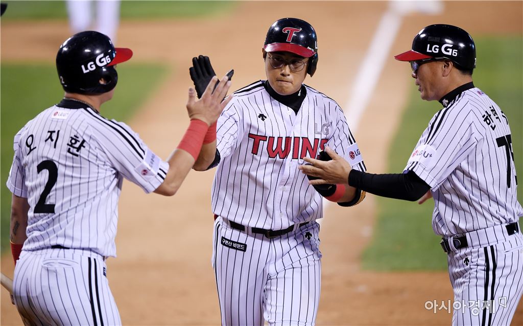 [아시아경제 김현민 기자]프로야구 롯데 자이언츠와 LG 트윈스의 2017 KBO리그 경기가 19일 잠실구장에서 열렸다. 4회말 2사 2루에서 LG 채은성이 롯데 선발 레일리를 상대로 투런 홈런을 치고 동료들과 하이파이브하고 있다. 김현민 기자 kimhyun81@asiae.co.kr<ⓒ세계를 보는 창 경제를 보는 눈, 아시아경제(www.asiae.co.kr) 무단전재 배포금지>