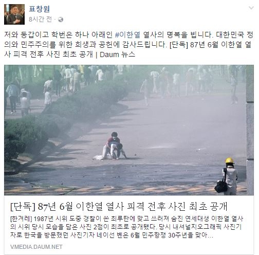 표창원 더불어민주당 의원이 공개된 이한열 열사 사진과 관련해 페이스북에 글을 남겼다/ 사진=표창원 페이스북