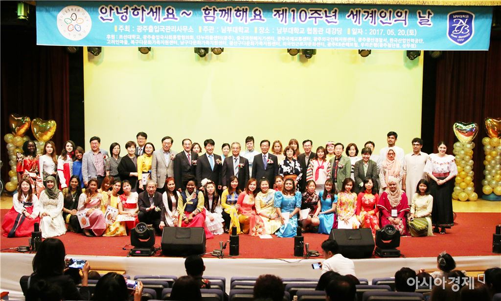 [아시아경제 노해섭 기자]제 10주년 세계인의 날 기념식이 ‘안녕하세요~ 함께해요 세계인의 날!!’라는 슬로건으로 20일 남부대학교 협동관 대강당에서 열렸다.이번 행사는 광주출입국관리소가 주최하고 남부대학교의 주관으로 국민과 재한 외국인이 서로의 문화와 전통을 존중하며 더불어 살아갈 수 있는 환경을 조성하기 위해 열렸다.기념식에는 김상진 광주출입국관리사무소장, 조성수 남부대학교총장. 손현우 주광주중국총영사, 강동완 조선대학교총장, 김대수 한국산업인력공단광주본부장, 신경구 광주국제교류센터장, 이상옥 이주가족복지회 이사장, 이천영 새날학교 교장, 한신애 북구다문화가족지원센터장 등 광주·전남 지역주민과 결혼이민자, 외국인 근로자, 외국인유학생 등 재한 외국인 500여명이 참석했다.광주출입국관리사무소 김상진 소장은 개회사에서 “광주출입국관리사무소에서는 광주·전남지역에 거주하는 외국인의 한국사회 적응과 정착을 돕기 위하여 사회통합프로그램, 이민자조기적응프로그램, 외국인을 위한 마을변호사제도 등의 다양한 지원정책을 시행하고 있다”고 말했다.노해섭 기자 nogary@<ⓒ세계를 보는 창 경제를 보는 눈, 아시아경제(www.asiae.co.kr) 무단전재 배포금지>