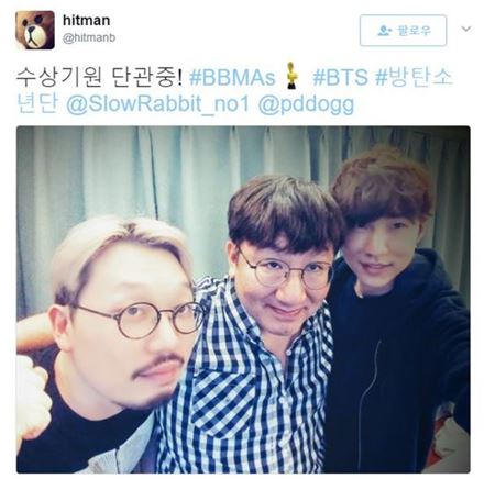 방탄소년단이 미국 라스베이거스에서 열린 '2017 빌보드 뮤직 어워드'에 참석한 가운데, 방시혁이 이들의 수상을 기원했다.방탄소년단의 소속사 빅히트엔터테인먼트의 대표 방시혁은 22일 자신의 트위터에 "수상 기원 단관 중!"이라는 글을 게시했다. 함께 올라온 사진 속에는 방시혁과 더불어 프로듀서 슬로우 래빗, 피독의 모습이 보인다.한편 방탄소년단은 22일 오전 7시(한국시간)부터 진행된 '2017 빌보드 뮤직 어워드' 마젠카펫(레드카펫 개념) 및 본 시상식에 참석 중이다.뮤지션 체인스모커스와 방탄소년단/사진=방탄소년단 트위터 캡처