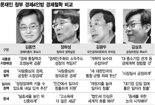 [아시아경제 조영주 기자] 문재인 정부의 경제 브레인들이 속속 결정되면서 이들이 앞으로 문재인 대통령의 핵심 성장정책인 '제이(J)노믹스'를 어떻게 추진할 지 주목된다. 소득주도 성장론과 적극적인 재정 투입에서 공감대가 형성되고 있지만, 재벌개혁과 증세 등에 대해서는 미묘하게 다른 입장도 보이기 때문이다.특히 문 대통령의 곁에서 정책 전반을 보좌하는 장하성 청와대 정책실장, '경제사령탑'인 김동연 경제부총리 후보자와 김상조 공정거래위원장 후보자, 경제자문을 맡은 김광두 국민경제자문회의 부의장의 색깔이 100% 일치하지는 않기 때문에 각각의 정책에서 조정과 타협이 절실하다.◆J노믹스로 접점 찾는 4인방= 문 대통령이 21일 단행한 정책라인 인사를 보면 꽤나 파격적이다. 안철수 캠프의 정책 멘토였던 장하성 고려대 교수를 청와대 정책실장에 기용했다. 박근혜 전 대통령의 가정교사로 불렸던 김광두 서강대 석좌교수에게는 경제자문 역할을 맡겼다. 일 잘하기로 소문난 관료 출신의 김동연 아주대 총장은 경제부총리 후보자로 지명했다.장 실장은 일단 경제철학에서 문 대통령과 통하는 점이 많다. 대표적으로 소득주도 성장론을 꾸준히 주장해왔다. 초기에 막대한 재정 투입을 통해 일자리를 늘리고 가계의 소득을 높여 경기회복의 마중물로 쓰겠다는 J노믹스와 맥을 같이 한다. 장 실장은 지난 17일 지명된 김상조 공정거래위원장 후보자와 함께 '재벌 저격수'로 불렸다. 이번에는 두 사람이 소득주도 성장을 위해 재벌기업을 압박하는 데 호흡을 맞추게 된다. 장 실장은 "모든 사람의 삶은 일에서 시작된다"며 "소득을 만들어내기 위한 일자리와 (거기서 나오는) 소득으로 소비, 국내 수요가 창출돼 기업의 새로운 투자가 활성화 되는 선순환 구조로 간다면 그것이 불평등을 해소하는 가장 근본적인 해결책"이라고 강조했다. 김동연 후보자의 첫마디도 "사람 중심의 일자리, 소득 중심의 성장을 생각하고 있다"였다. 개혁적 보수 성향인 김 부의장은 J노믹스의 설계에 참여했다. 그는 사람 중심의 경제성장에 대해 "성장과 분배를 조화시킬 수 있는 최적의 선택은 사람"이라며 "사람을 보다 유능하게 해주면 그 사람의 소득이 올라가지 않느냐. 그 사람이 유능하게 되면 속한 기업이나 조직의 경쟁력이 올라가고, 나라 전체의 경쟁력이 올라간다"고 주장했다. ◆추경·증세 각론엔 갈등 가능성= 당장 새 정부가 10조원 규모의 추가경정예산(추경)을 통해 공공부문 일자리를 대거 늘리는 것에 대해 의견 조율이 필요하다. 단기적인 일자리 만들기에 돈을 쓸 것이냐, 성장잠재력을 키우는 예산 비중을 늘릴 것이냐를 결정해야 한다.김동연 후보자는 "(일자리 창출을 위해) 추경을 하는 것도 중요하지만 더 중요한 것은 추경의 내용"이라며 "실제 효과가 나오도록 내실을 기해야 한다"고 밝혔다. 장 실장은 "지금 우선적으로 정부가 할 수 있는 부분은 공공부문 일자리지만 결국 절대 다수의 일자리는 민간에서 만들어지는 것"이라며 민간부분 고용창출을 강조하기도 했다.증세도 논란이 불가피할 전망이다. 김동연 후보자는 "실효세율을 높일 방안을 봐야 한다. 조세감면 혜택을 다시 보고 분리과세를 종합과세로 본다든지 세정 측면에서 먼저 찾아보는 것이 먼저다"며 "법인세 증세 문제는 아주 신중히 접근해야 한다"고 언급했다.장 실장은 "당연히 고소득이 있으면 더 많은 세금을 내야 한다"면서도 "단순히 법인세율을 인상한다고 될 문제는 아니다"고 밝혔다. 김 부의장은 "국제적인 흐름을 봐야 한다"며 사실상 법인세율 인상에 반대하는 입장을 피력했다. 이들의 발언만 놓고 보면 문 대통령 임기 내에 점진적으로 추진할 지, 법인세 외의 다른 세목만 건드릴 지도 불확실한 상황이다. 재벌개혁에 관해서는 장 실장과 김상조 후보자 모두 '때려잡기'나 '해체'를 하자는 것이 아니라는 뜻을 밝혔지만 대기업들이 느끼는 부담은 만만치 않다. 이번 인사에서 경제정책 수립과 실행의 주도권을 청와대가 쥔 것으로 나타나면서 개혁속도가 한층 빨라질 가능성이 높아졌기 때문이다.세종=조영주 기자 yjcho@asiae.co.kr<ⓒ세계를 보는 창 경제를 보는 눈, 아시아경제(www.asiae.co.kr) 무단전재 배포금지>