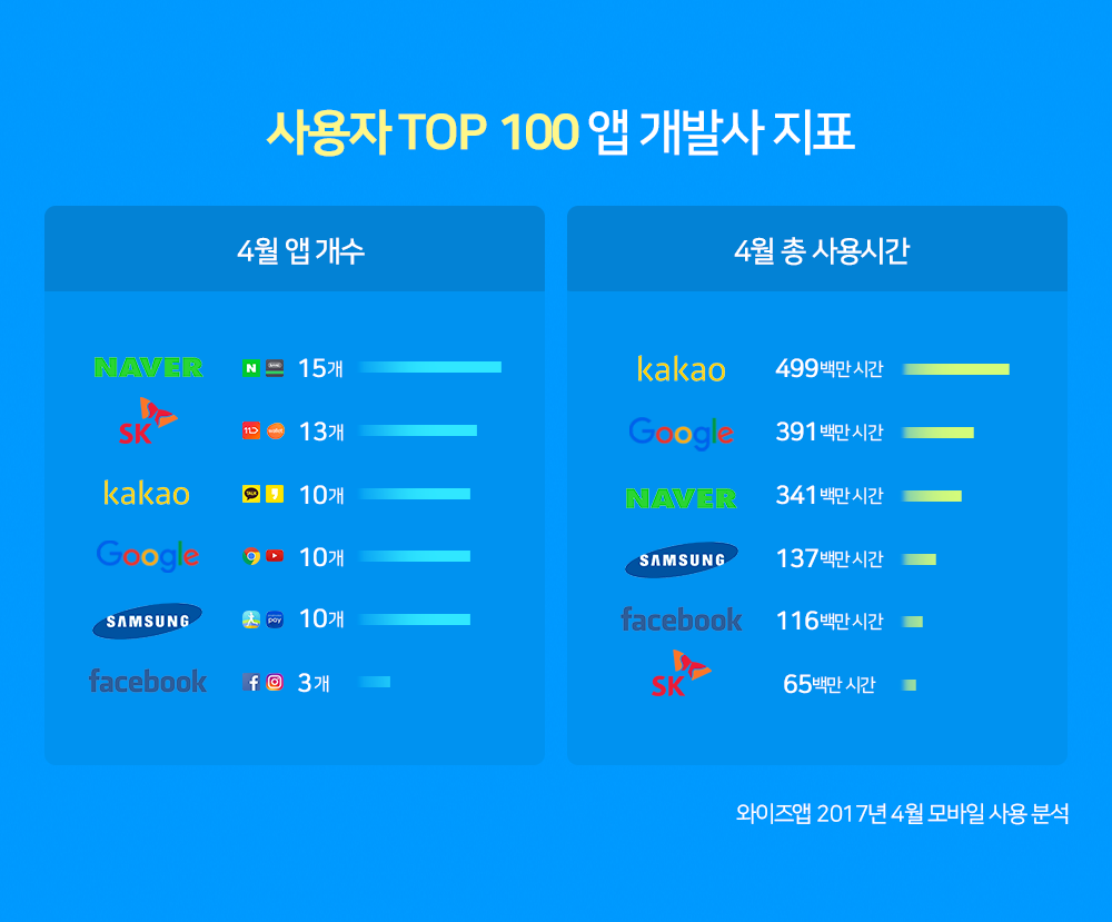 [아시아경제 안하늘 기자]4월 우리나라 사람들이 가장 많이 이용한 상위 100개 앱 중 15개는 네이버가 개발한 앱이었다. 카카오가 개발한 앱의 총 이용시간은 5억시간에 달했다.23일 앱 분석 업체 와이즈앱은 이 같은 내용을 담은 '4월 한국 안드로이드 앱 사용자 수 상위 100개 앱 개발사 지표' 보고서를 발표했다.이용자 수 상위 100개에 가장 많은 수를 올린 개발사는 네이버로 15개였으며, SK가 13개, 카카오, 구글, 삼성전자가 10개였다. 페이스북은 3개로 나타났다.이 중 네이버, 카카오, 페이스북은 선탑재 앱이 없다는 점에서 주목할 만 하다. SK와 구글, 삼성전자는 각각 통신사, 운영체제(OS), 제조사로 자사의 앱을 제품에 선탑재를 할 수 있기 때문에 자연스럽게 이용자 수가 많다고 볼 수 있다.상위 100개의 개발사 별 이용시간은 카카오가 5억 시간이며, 구글이 3억9000만시간, 네이버가 3억4000만시간, 삼성전자가 1억3700만시간, 페이스북이 1억1600만시간, SK가 6500만시간으로 나타났다. SK는 이용자 수는 많은 반면 앱 사용시간은 적었다. 이 역시 선탑재 앱의 영향으로 해석할 수 있다. 반면 페이스북은 사용자 수가 많은 앱이 3개 뿐이지만 사용 시간으로는 1억1600만분에 달해 그만큼 많은 이용자들을 오래 머물게 하고 있다는 것을 알 수 있다. 위 조사는 4월 한 달 동안 와이즈앱이 전국 2만3663명의 안드로이드 스마트폰 이용자 표본조사로 실시됐다. 95% 신뢰수준에서 오차 범위 ±0.64%다.안하늘 기자 ahn708@asiae.co.kr<ⓒ세계를 보는 창 경제를 보는 눈, 아시아경제(www.asiae.co.kr) 무단전재 배포금지>