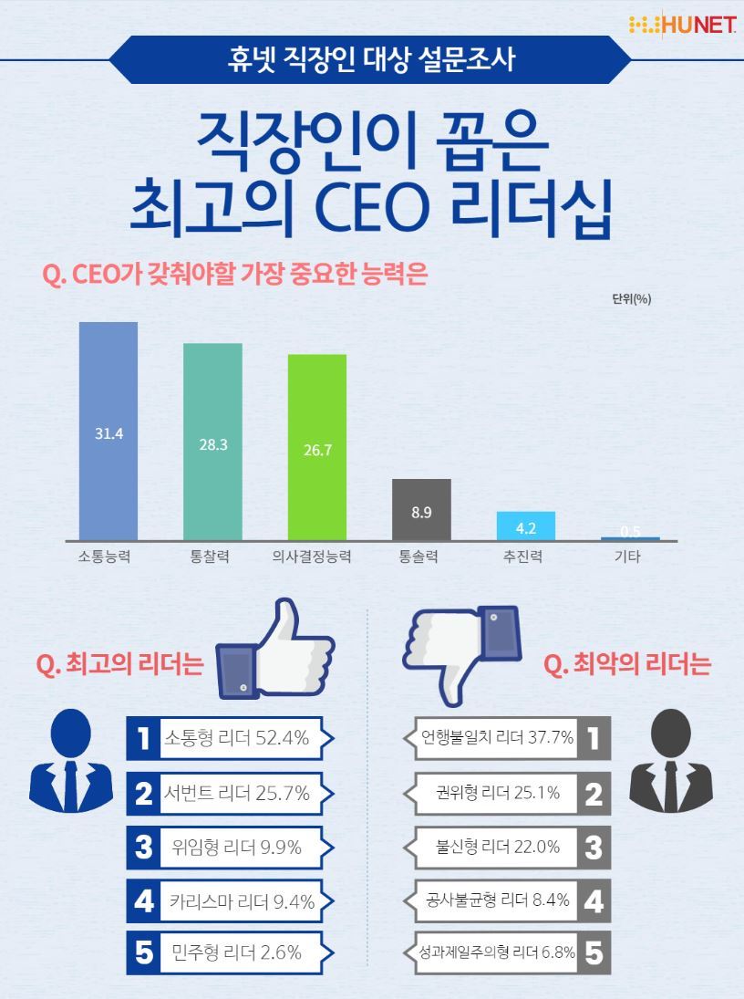 휴넷, 직장인 812명 대상 조사52.4%, '소통형 리더'가 최고…'언행불일치형 리더' 최악리더가 갖춰야할 능력으로도 '소통능력' 1위 꼽아