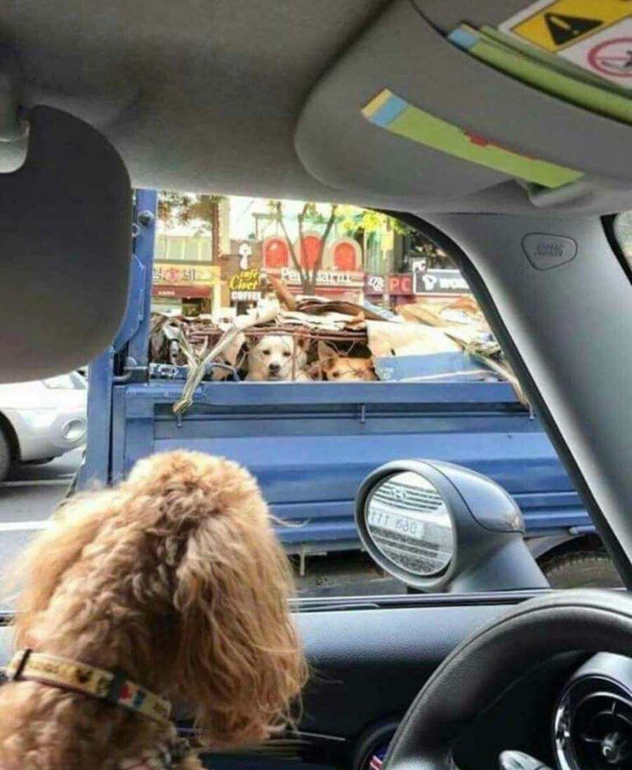 “세상에서 가장 슬픈 사진이다”23일 트위터, 페이스북 등 소셜네트워크(SNS)는 물론 각종 인터넷 커뮤니티를 강타한 한 장의 사진이 네티즌들을 울리고 있다. 사진에는 트럭에 실려 어딘가로 끌려가고 있는 반려견이 맞은편 자가용 안 운전자석에 앉아 한가로이 창밖 풍경을 바라보던 반려견과 마주친 장면이다. 특히 철창에 갇혀 맞은편 반려견을 바라보는 백구의 눈빛이 보는 이의 마음을 아프게 하고 있다. 네티즌들은 트럭에 실린 반려견들이 보신탕 집이나 어디론가 팔려가는 것으로 추정했다. 한 네티즌은 “구해주지 못해서 미안해”, “세상에서 가장 슬픈 사진이다”, “가슴이 아프네요, 생사를 오가는 순간입니다” , “인생사 금수저 흙수저로 볼 수 있는데, 개들도 금밥그릇 흙밥그릇이다”, “빈부격차가 아니라 빈부견차네” 라며 가슴 아파했다.아시아경제 티잼 한승곤 기자 hsg@asiae.co.kr<ⓒ세계를 보는 창 경제를 보는 눈, 아시아경제(www.asiae.co.kr) 무단전재 배포금지>