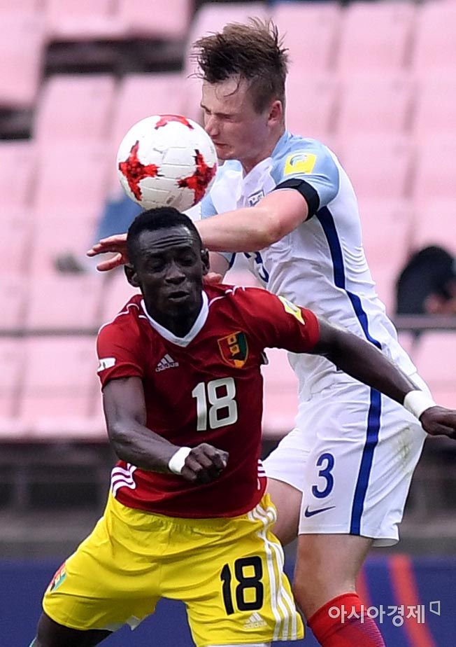[전주=아시아경제 김현민 기자]국제축구연맹(FIFA) U-20 월드컵 코리아 2017 A조 조별리그 잉글랜드와 기니의 경기가 23일 전주월드컵경기장에서 열렸다. 잉글랜드 코널리가 상대 수마와 헤딩 경합하고 있다. 김현민 기자 kimhyun81@asiae.co.kr<ⓒ세계를 보는 창 경제를 보는 눈, 아시아경제(www.asiae.co.kr) 무단전재 배포금지>