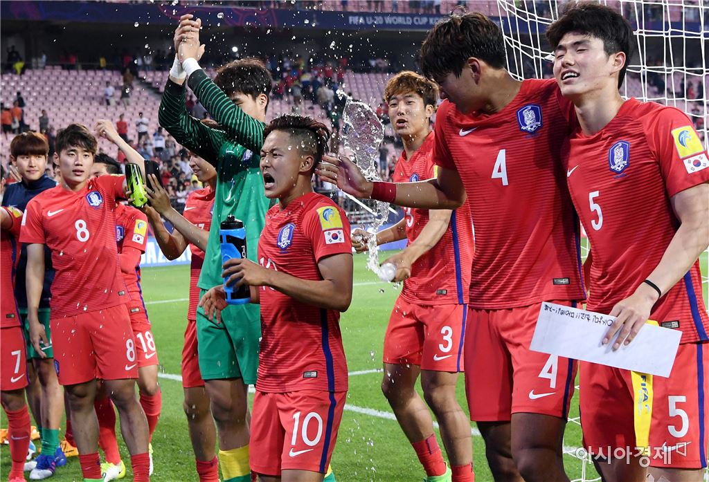 [전주=아시아경제 김현민 기자]국제축구연맹(FIFA) U-20 월드컵 코리아 2017 A조 조별리그 대한민국과 아르헨티나의 경기가 23일 전주월드컵경기장에서 열렸다. 대표팀 선수들이 2-1 승리로 16강 진출을 확정한 뒤 기뻐하고 있다. 김현민 기자 kimhyun81@asiae.co.kr<ⓒ세계를 보는 창 경제를 보는 눈, 아시아경제(www.asiae.co.kr) 무단전재 배포금지>
