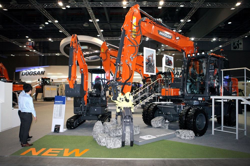 ▲두산인프라코어는 24~27일까지 일산 킨텍스에서 열리는 '2017 한국국제건설기계전'에 참가한다. 두산인프라코어가 사전계약 판매에 나서는 미니굴삭기 DX35Z-5(사진 왼쪽)와 3단 붐 휠굴삭기 DX160W-5K가 관람객 맞이를 준비하고 있다.