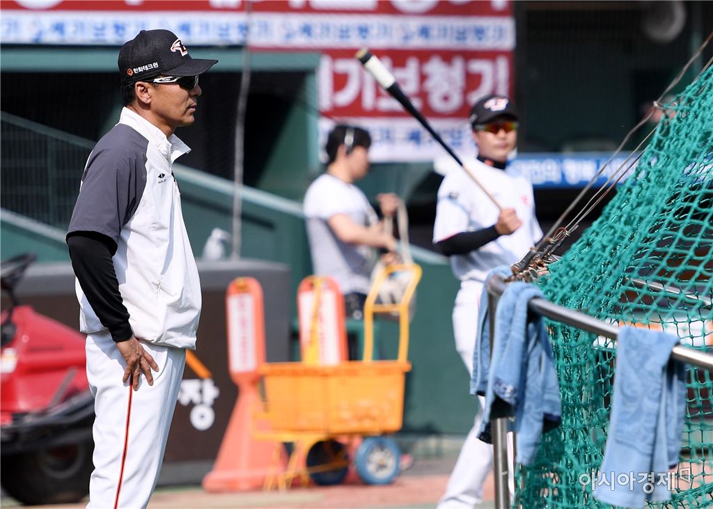 [대전=아시아경제 김현민 기자]24일 대전구장에서 열릴 프로야구 KIA 타이거즈와 한화 이글스의 2017 KBO리그 경기에 앞서 한화 이상군 감독대행이 선수들의 훈련을 바라보고 있다. 김현민 기자 kimhyun81@asiae.co.kr<ⓒ세계를 보는 창 경제를 보는 눈, 아시아경제(www.asiae.co.kr) 무단전재 배포금지>