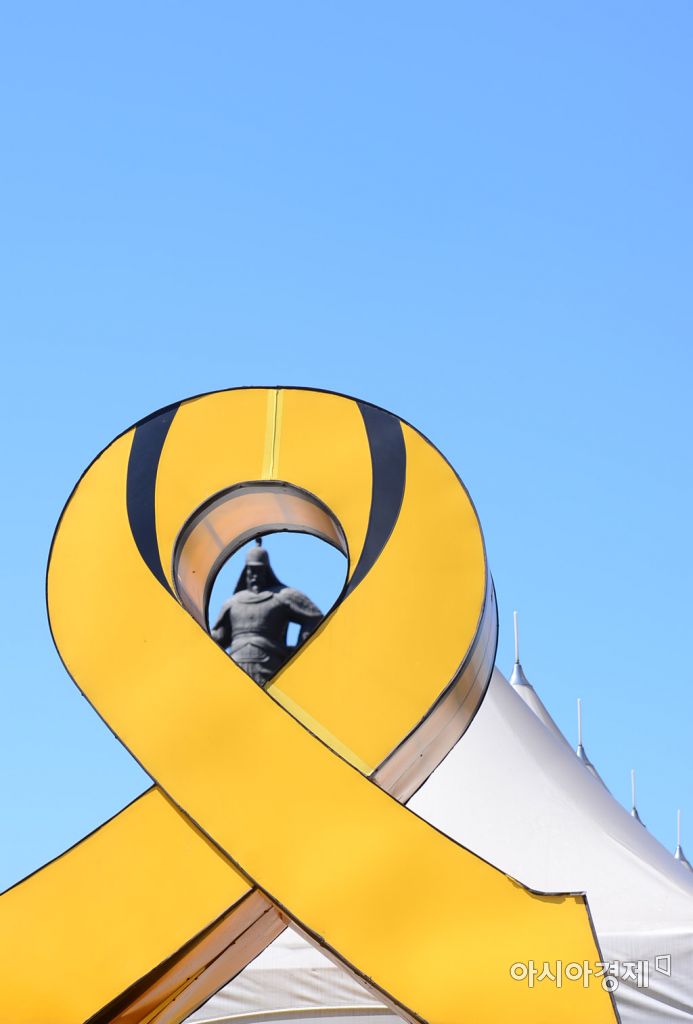 [아시아경제 문호남 수습기자] 24일 서울 종로구 광화문광장에서 세월호 참사를 추모하는 노란 리본 조형물 안으로 이순신 장군 동상이 보이고 있다.문호남 수습기자 munonam@asiae.co.kr<ⓒ세계를 보는 창 경제를 보는 눈, 아시아경제(www.asiae.co.kr) 무단전재 배포금지>