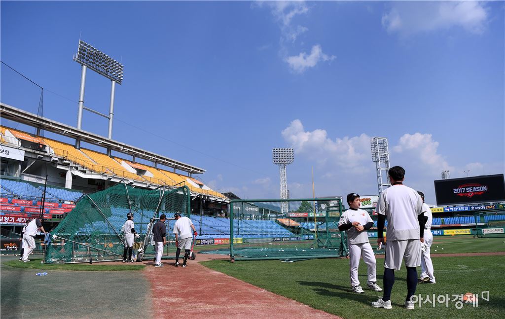 [대전=아시아경제 김현민 기자]24일 대전구장에서 열릴 프로야구 KIA 타이거즈와 한화 이글스의 2017 KBO리그 경기에 앞서 한화 훈련을 하고 있다. 김현민 기자 kimhyun81@asiae.co.kr<ⓒ세계를 보는 창 경제를 보는 눈, 아시아경제(www.asiae.co.kr) 무단전재 배포금지>