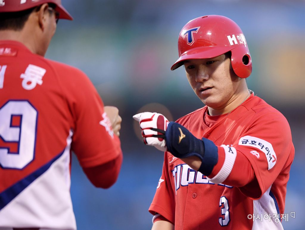 [대전=아시아경제 김현민 기자]프로야구 KIA 타이거즈와 한화 이글스의 2017 KBO리그 경기가 24일일 대전구장에서 열렸다. 3회초 2사 1,3루에서 KIA 김선빈이 추가 1타점 적시타를 치고 김태룡 코치와 하이파이브하고 있다. 김현민 기자 kimhyun81@asiae.co.kr<ⓒ세계를 보는 창 경제를 보는 눈, 아시아경제(www.asiae.co.kr) 무단전재 배포금지>