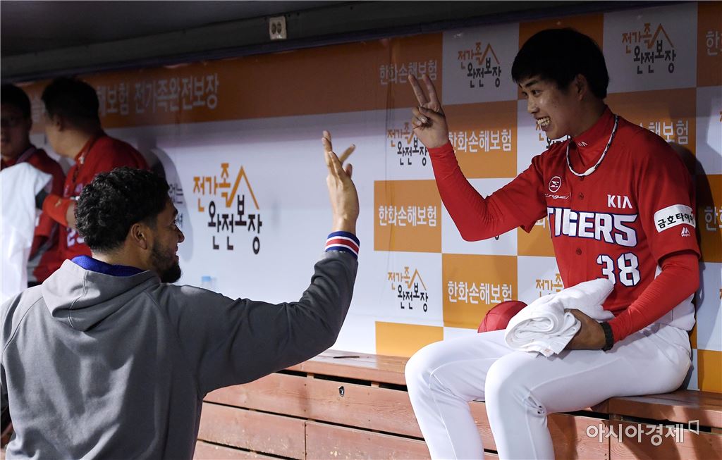 [대전=아시아경제 김현민 기자]프로야구 KIA 타이거즈와 한화 이글스의 2017 KBO리그 경기가 24일일 대전구장에서 열렸다. KIA 선발 임기영이 8회말 고효준과 교체된 뒤 더그아웃에서 헥터와 세리머니하고 있다. 임기영은 7이닝 1실점 호투했다.김현민 기자 kimhyun81@asiae.co.kr<ⓒ세계를 보는 창 경제를 보는 눈, 아시아경제(www.asiae.co.kr) 무단전재 배포금지>