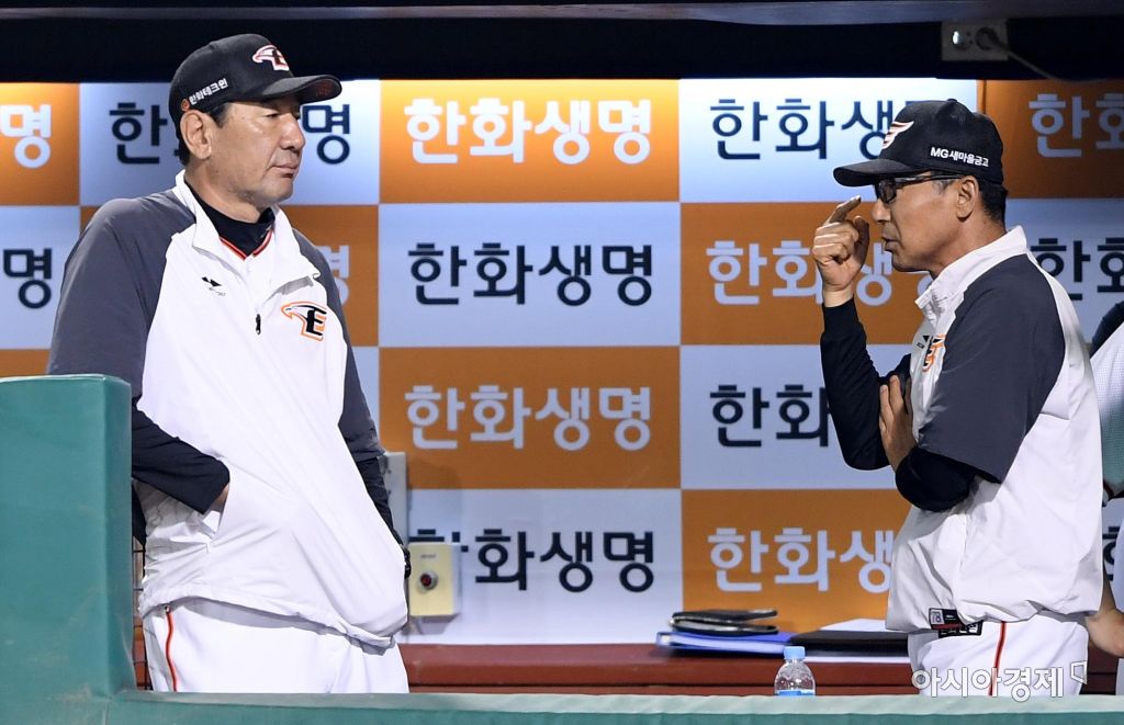 [대전=아시아경제 김현민 기자]프로야구 KIA 타이거즈와 한화 이글스의 2017 KBO리그 경기가 24일일 대전구장에서 열렸다. 한화 더그아웃의 이상군 감독대행이 코치들과 이야기하고 있다.김현민 기자 kimhyun81@asiae.co.kr<ⓒ세계를 보는 창 경제를 보는 눈, 아시아경제(www.asiae.co.kr) 무단전재 배포금지>