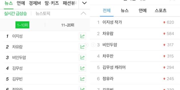 당구선수 차유람과 이지성 작가가 '택시'에 출연해 화제를 모은 가운데, 차유람이 출연 소감을 전했다. 차유람은 25일 자신의 인스타그램에 "네이버 다음 나란히 실검 1·2위다. 그래도 열심히 녹화했는데 많이 봐주셔서 다행이고 감사하다"면서 포털사이트 실시간 검색어를 캡처해 올렸다.공개된 사진 속에는 차유람과 이지성의 이름이 1위와 2위를 각각 장식하고 있다. 특히, 실시간 검색어 4~5위는 전날 '노 룩 패스'(No look pass) 태도 논란에 휩싸인 김무성 바른정당 의원으로, 이들 부부가 김 의원을 앞질러 눈길을 끈다. 한편, 차유람 이지성 부부는 24일 tvN '현장토크쇼 택시'에 출연해 러브스토리와 자택을 공개했다. 아시아경제 티잼 최지혜 기자 cjh140117@asiae.co.kr<ⓒ세계를 보는 창 경제를 보는 눈, 아시아경제(www.asiae.co.kr) 무단전재 배포금지>