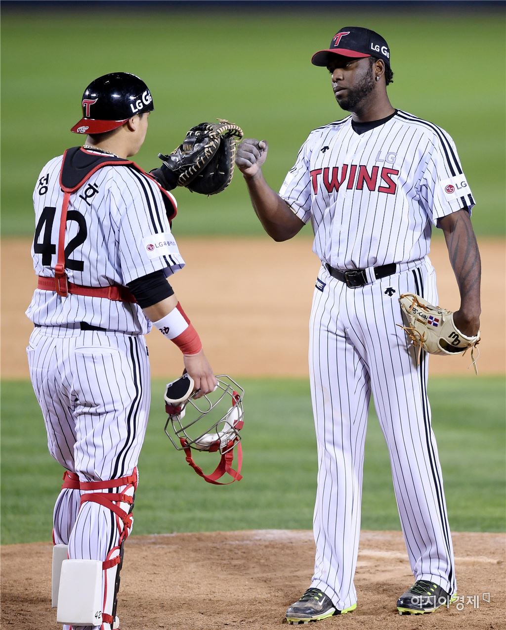 [아시아경제 김현민 기자]프로야구 두산 베어스와 LG 트윈스의 2017 KBO리그 경기가 일 잠실구장에서 열렸다. 7회초 1사 1루에서 LG 선발 소사가 마운드를 내려가며 정상호 포수와 하이파이브하고 있다.김현민 기자 kimhyun81@asiae.co.kr<ⓒ세계를 보는 창 경제를 보는 눈, 아시아경제(www.asiae.co.kr) 무단전재 배포금지>