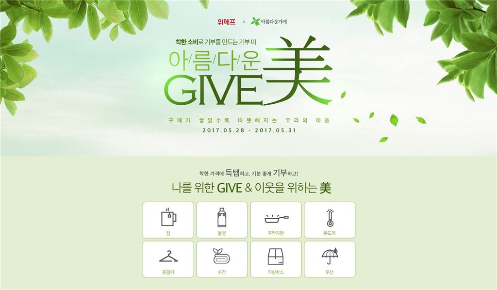 [아시아경제 김유리 기자] 위메프는 생활·주방 19개 파트너사들과 함께 '기부미(美) 데이' 기획전을 오는 28일부터 31일까지 4일간 진행한다.위메프는 기부美 데이를 통해 생활·주방·건강 카테고리 내 리빙박스, 찜질팩, 옷걸이, 우산, 식탁매트 등 인기 상품 19종을 최저가로 판매하고, 판매 수량의 10%씩을 추가한 수량만큼 아름다운 가게로 6월 초에 전달할 예정이다. 이번 기부美 데이 기획전에 참여하는 업체는 까사마루, DH쇼핑, 가온, 가쯔, 니즈인터내셔날, 더은, 동화리빙, 신세계코리아, 씨엔디상사, 에스티아이그룹, 에이플물류, 올리빙, 위드기프트, 위드원, 제이가구, 수건넷, 아소리빙, 홈스웰, 홈앤리빙 등이다.위메프는 앞서 지난 달에도 10개 파트너사들과 함께 기부 美 데이를 진행하고, 그 결과로 총 1014개 물품을 아름다운 가게로 전달한 바 있다.김선양 위메프 홈데코취미사업부 부장은 "지난 달에 이어 이번 달에도 생활·주방 관련 인기상품들을 최저가에 구매할 수 있고 동시에 기부에 참여도 할 수 있는 '기부美 데이'를 진행한다"며 "앞으로도 다양한 형태의 기부 이벤트를 마련해나갈 예정"이라고 말했다. 김유리 기자 yr61@asiae.co.kr<ⓒ세계를 보는 창 경제를 보는 눈, 아시아경제(www.asiae.co.kr) 무단전재 배포금지>