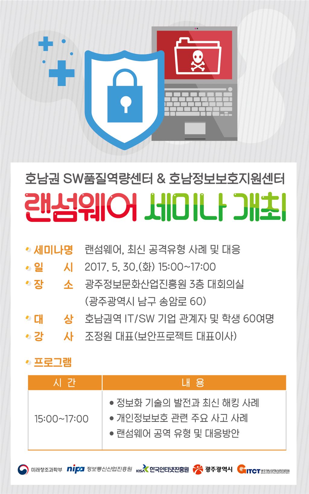 [아시아경제 노해섭 기자]광주정보문화산업진흥원은 30일 광주CGI센터에서 최근 사회 문제로 대두된 데이터 인질극 ‘랜섬웨어’와 관련하여 “랜섬웨어 최신 공격 유형 사례 및 대응 세미나”를 개최한다고 밝혔다. 랜섬웨어는 몸값(Ransom)과 소프트웨어(Software)의 합성어로 해커가 시스템을 잠그거나 데이터를 암호화하여 사용할 수 없도록 만든 뒤 이를 인질로 금전을 요구하는 악성프로그램을 말한다. 얼마 전 ‘워너크라이 랜섬웨어’의 공격으로 인해 150개국 20만대 이상의 PC가 감염됐다. 국내에서는 2천 건에 달하는 피해가 접수되었고, 향후 추가 사이버공격이 있을 수 있어 안심할 수 없는 상황이다. 이와 관련하여 광주정보문화산업진흥원의 호남권 SW품질역량센터와 호남정보보호지원센터에서는 이번 세미나를 통해 정보화 기술의 발전과 최신 해킹 사례, 개인정보보호 관련 주요 사고 사례 및 랜섬웨어 공격 유형 및 대응 방안에 대해 알아보는 자리를 마련했다. 광주광역시와 광주정보문화산업진흥원은 미래창조과학부, 정보통신산업진흥원(NIPA), 한국인터넷진흥원(KISA)과 함께 지역 중소기업의 SW품질 향상과 정보보호 산업 육성을 위해 호남권SW역량강화센터와 호남정보보호지원센터를 운영하고 있다. 광주정보문화산업진흥원 이정현 원장은“최근 랜섬웨어 공격과 관련하여 지역 중소기업의 대응 능력 향상을 위한 지원을 아끼지 않겠다”고 말했다. 세미나는 무료로 진행되며 신청은 온라인으로 가능하며(온오프믹스, //onoffmix.com/event/101266), 기타 사항은 호남권SW역량강화센터(062-610-2444) 및 호남정보보호지원센터(062-350-1122)로 문의하면 된다. 노해섭 기자 nogary@<ⓒ세계를 보는 창 경제를 보는 눈, 아시아경제(www.asiae.co.kr) 무단전재 배포금지>
