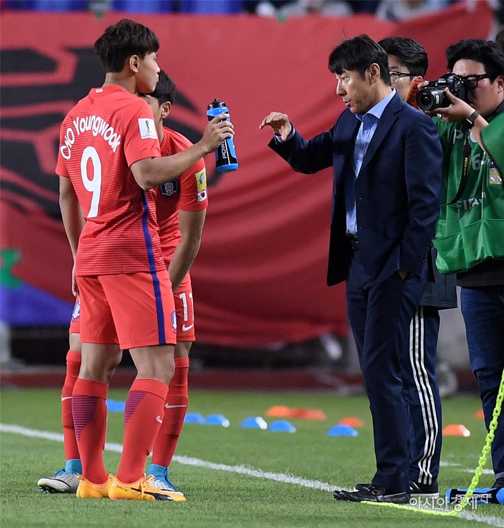 [수원=아시아경제 김현민 기자]국제축구연맹(FIFA) U-20 월드컵 코리아 2017 A조 대한민국과 잉글랜드의 조별리그 최종전이 26일 수원월드컵경기장에서 열렸다. 한국 신태용 감독이 조영욱에게 이야기하고 있다. 김현민 기자 kimhyun81@asiae.co.kr<ⓒ세계를 보는 창 경제를 보는 눈, 아시아경제(www.asiae.co.kr) 무단전재 배포금지>