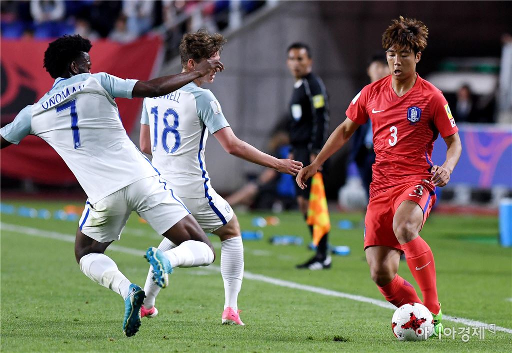 [수원=아시아경제 김현민 기자]국제축구연맹(FIFA) U-20 월드컵 코리아 2017 A조 대한민국과 잉글랜드의 조별리그 최종전이 26일 수원월드컵경기장에서 열렸다. 한국 우찬양이 상대 수비를 뚫고 공격하고 있다. 김현민 기자 kimhyun81@asiae.co.kr<ⓒ세계를 보는 창 경제를 보는 눈, 아시아경제(www.asiae.co.kr) 무단전재 배포금지>