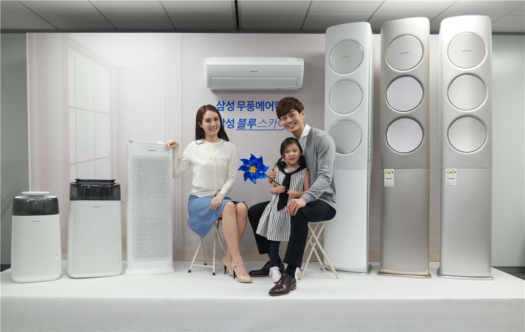 모델들이 삼성전자 무풍에어컨과 공기청정기 블루스카이 앞에서 포즈를 취하고 있다.
