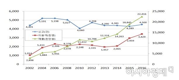 [아시아경제 오현길 기자] 지난해 낚시 어선 이용객수가 역대 최고치인 343만명을 돌파했다. 바다낚시가 해양레저산업으로 인기를 끌고 있는 것으로 나타났다.28일 해양수산부가 발표한 '2016년도 낚시어선업 운영현황'에 따르면 지난해 낚시어선 신고 척수는 전년 대비 4.9% 증가한 4500척으로 조사됐다.낚시어선 이용객 수는 약 343만명으로 전년 보다 15.9%나 증가했다.산업 전체 매출과 낚시어선 1척당 매출액은 2242억원, 500만원으로 전년 보다 각각 18.9%, 13.6% 늘었다.지역별 낚시어선 척수 현황을 살펴보면 충남 1154척(25.6%), 경남 1036척(23.0%), 전남 830척(18.4%) 등 3개 지자체가 전체 신고어선의 67.1%를 운영 중이다.이용객은 경남이 84만명(24.4%), 충남 64만명(18.6%), 전남 54만명(15.7%) 순으로, 3개 지자체가 전체의 58.9%(202만 명)를 차지했다.매출액은 경남 648억원(28.9%), 충남 526억원(23.5%), 전남 338억원(15.0%)이었다.낚시어선 1척당 매출액이 가장 많은 지역은 전북으로 8900만원이었으며, 1인당 낚시어선 이용 금액은 충남이 8만3000원으로 가장 높았다.신현석 해수부 어업자원정책관은 "낚시 인구는 계속 증가할 것으로 예상되며 어업 외 소득과 일자리 창출, 지역경제 활성화 등에 큰 도움이 될 것"이라며 "낚시 안전수칙 준수 등 선진 낚시문화 정착이 반드시 필요한 만큼, 국민들의 적극적인 협조를 부탁드린다"고 당부했다.연도별 낚시어선업 운영 현황(자료:해양수산부)