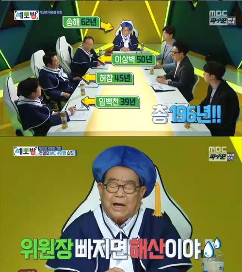 '세모방' 네 명의 할배가 관록의 귀여움을 발산했다.28일 첫 방송된 MBC '일밤-세모방 : 세상의 모든 방송'에서는 방송인 송해, 이상벽, 허참, 임백천이 출연해 기대감을 자아냈다.'세모방'은 국내는 물론 해외의 실제 프로그램들까지 출연자들이 함께 참여해서 만들어가는 리얼리티 예능 프로그램으로 출연자들이 세계 각국의 방송 프로그램에 투입돼 제작회의부터 촬영까지 참여하는 신개념 방송이다.이날 송해, 이상벽, 허참, 임백천은 '세모방' 출연자들의 방송을 평가하는 '세모방 위원회' 위원으로 참여해 냉정한 평가를 건넸다.이후 자막으로 네 사람의 나이 도합 288년, 방송 경력 도합 196년이라는 엄청난 기록이 공개돼 놀라움을 전했다. 방송 경력 62년의 '세모방 위원회' 위원장 송해(90), 방송 경력 39년 차 임백천(59), 방송 경력 45년 차 허참(69), 방송 경력 50년 차 이상벽(71)이 대기실에 모이자 프로그램 제작진은 물론 MBC 간부급 인사들까지 줄줄이 내려와 인사를 건네는 진풍경이 벌어졌다.네 명의 전설들을 마주한 박수홍은 "모두 너무 귀여우시다"며 인사를 건넸고, 송해는 "귀여워 봬?"라고 반문한 뒤 "까꿍!"하며 귀여운 포즈를 취해 웃음을 자아냈다.박명수가 "경력들이 다 되시니까 딱 보면 방송이 된다 안 된다를 아시겠다"고 묻자 허참은 "'누구 하나만 빼면 된다' 이런 걸 안다"고 말해 출연자들을 긴장케 했다.이어 허참은 "우리가 빠질 수도 있다"고 너스레를 떨었고 이에 박명수는 "위원장님은 안 빠지시겠죠?"라며 송해를 바라봤다.그러자 이상벽은 "그건 몰라"라며 농담을 건넸고, 송해는 "위원장 빠지면 해산이야"라고 엄포해 폭소를 유발했다.한편 이날 '세모방' 출연자 남희석, 박수홍, 김수용은 몽골 C1TV 인기 프로그램 '도시아들'에 출연해 발징념PD와 함께 몽골 유목 생활을 떠났다.아시아경제 티잼 송윤정 기자 singasong@asiae.co.kr<ⓒ세계를 보는 창 경제를 보는 눈, 아시아경제(www.asiae.co.kr) 무단전재 배포금지>