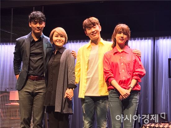 배우 김보강, 김경선, 송유택, 양지원(왼쪽부터)이 29일 오후 서울 드림아트센터 1관에서 열린 뮤지컬 '투모로우 모닝' 프레스콜에 참석해 기념촬영을 하고 있다.