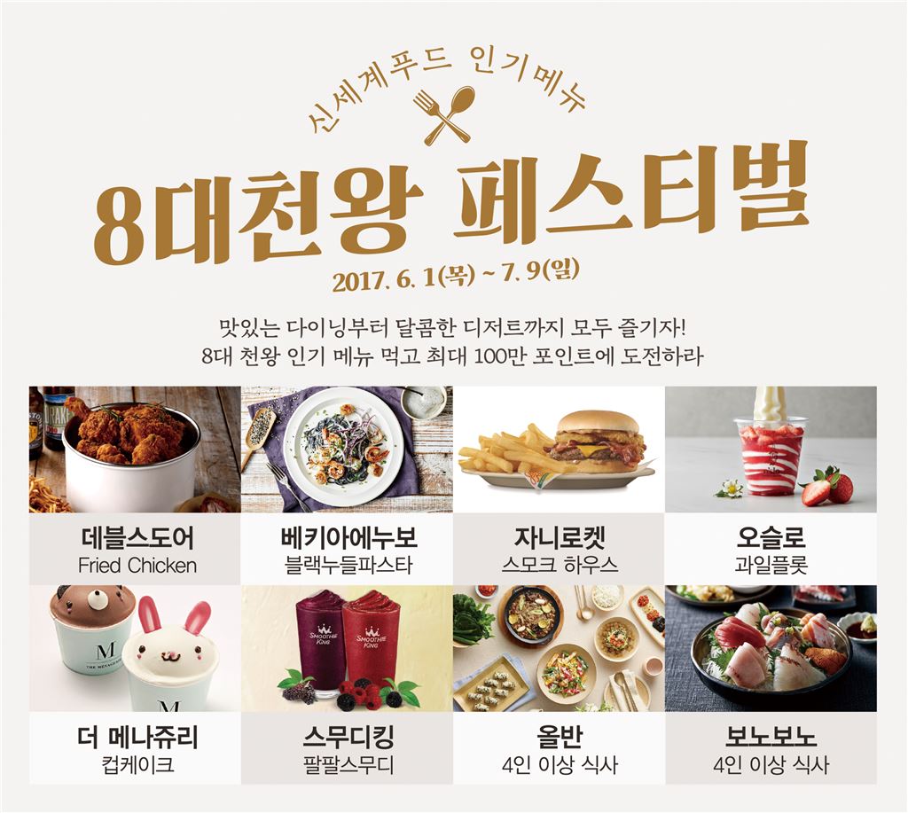 [아시아경제 이선애 기자]신세계푸드가 8개 외식 브랜드에서 인기 메뉴를 구입한 고객에게 100% 당첨 스크래치 쿠폰을 제공하는 ‘8대 천왕 페스티벌’을 실시한다.오는 6월1일부터 7월9일까지 신세계푸드가 운영하는 8개 외식 브랜드에서 실시되는 이번 행사에서는 각 브랜드의 인기 메뉴 가운데 1종을 구입한 고객에게 100% 당첨 스크래치 쿠폰을 증정한다. 스크래치 쿠폰을 받은 고객은 신세계푸드 통합 멤버십 서비스인 ‘신세계 푸딩 플러스’ 앱에 접속해 쿠폰에 적힌 응모번호를 입력하면 즉시 사용이 가능한 경품 쿠폰을 받을 수 있다.1등(1명)에 당첨된 고객에게는 신세계푸드의 외식 브랜드 매장에서 현금처럼 사용할 수 있는 100만 포인트가 제공된다. 또한 2등(2명)에게는 50만 포인트, 3등(10명)에게는 10만 포인트, 4등(300명)에게는 1만 포인트, 5등(7만명)에게는 10% 할인쿠폰 등 다양한 혜택이 주어진다.한편 신세계푸드는 ‘올반’, ‘보노보노’, ‘데블스도어’, ‘베키아에누보’, ‘자니로켓’, ‘오슬로’, ‘더 메나쥬리’, ‘스무디킹’ 등을 운영하고 있다. 이선애 기자 lsa@asiae.co.kr<ⓒ세계를 보는 창 경제를 보는 눈, 아시아경제(www.asiae.co.kr) 무단전재 배포금지>