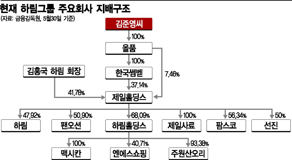 [아시아경제 박미주 기자]김홍국 하림그룹 회장(60)이 아들 준영씨(25)에게 5년여 전 100억원대 증여세를 내고 물려준 회사 올품(옛 한국썸벧판매)이 계열사 58개, 10조원 이상의 자산 가치를 지닌 하림그룹을 지배하게 됐다. 하림그룹의 지주사인 제일홀딩스의 최대주주도 사실상 아들 준영씨다.31일 금융감독원 전자공시시스템과 업계에 따르면 내달 코스닥시장에 상장을 앞둔 하림의 지주사 제일홀딩스의 주주 현황에서 김 회장의 지분이 41.78%로 가장 많다. 이어 한국썸벧(37.14%), 올품(7.46%) 순으로 보유하고 있다. 그런데 한국썸벧과 올품은 김준영씨 개인 회사다. 한국썸벧 지분 100%를 올품이 보유하고 있고, 올품 지분 100%는 김준영씨 소유다. 준영씨가 44.6%로 제일홀딩스 지분을 가장 많이 보유하고 있는 셈이다.지난해 초만 해도 제일홀딩스의 최대주주는 제일홀딩스였다. 자사주가 80%에 이르러서다. 당시 김 회장의 지분율은 8.14%, 한국썸벧은 7.35%, 올품은 1.48%였다. 이를 포함한 최대주주측 지분율은 18.48%였다. 그런데 지난해 11월 제일홀딩스는 408만1991주에 달하는 자사주를 무상 소각했다. 액면분할까지 거치며 최대주주측 지분율은 93.43%로 급증했다. 동시에 김 회장 지분율은 41.78%, 준영씨 회사의 지분율은 44.6%로 늘어났다.준영씨가 하림그룹의 지배구조 정점에 올라선 것은 김 회장의 증여와 비상장 자회사간 흡수합병 등을 통해서다. 2012년 말 준영씨는 김 회장으로부터 당시 한국썸벧판매(현 올품) 지분 100%를 증여받았다. 2009년말 자본금 20억원에 총자산 656억원, 매출 557억원, 영업이익 70억원을 기록한 한국썸벧은 2010년 한국썸벧과 이를 지배하는 한국썸벧판매로 물적분할했다. 김 회장은 '한국썸벧판매→한국썸벧→제일홀딩스→하림'으로 이어지는 지배구조를 구축했다. 그 다음 한국썸벧판매를 준영씨에게 넘겼다. 2013년 한국썸벧판매가 옛 올품을 흡수합병하며 올품으로 사명을 바꿨다.증여세는 100억원 이상인 것으로 알려졌다. 준영씨는 지난해 1월 올품 유상감자로 100억원을 마련해 세금을 냈다. 올품이 보통주 6만2500주를 주당 16만원에 매수해 소각하며 100억원이 유일한 주주인 준영씨에게 쥐어졌다.일각에서는 편법 승계 의혹을 제기하고 있다. 업계 관계자는 "현행법상 과세표준액이 30억원을 넘는 경우 50%의 증여세가 부과되는데 100억원 이상의 세금만으로 하림그룹을 물려주는 건 말이 안 된다. 꼼수를 쓴 것 아니냐"며 "하림그룹 내 다른 회사 주주들의 이익이 일감몰아주기 등 탈법적 통로로 전이됐을 수 있다"고 지적했다. 이에 대해 하림그룹 관계자는 "올품 주식 증여세는 연납으로 인정돼 나눠서 돈을 내다가 유상감자로 얻은 대금 100억원 전량을 증여세 납부에 사용했다"며 "전체 증여세 규모는 알 수 없다"고 말했다. 이어 "올품 증여는 회사 규모가 커지기 전 일이고, 상속도 경영이라는 걸 숙지해 오너리스크를 줄이기 위한 단계를 밟아간 것"이라며 "하림이 윤리경영을 해온 건 자부한다"고 덧붙였다.한편 하림그룹은 총 자산 10조5000억원이 돼 이달 초 공정거래위원회로부터 상호출자와 채무보증이 제한되는 대기업집단으로 지정됐다.<관련기사>박미주 기자 beyond@asiae.co.kr<ⓒ세계를 보는 창 경제를 보는 눈, 아시아경제(www.asiae.co.kr) 무단전재 배포금지>