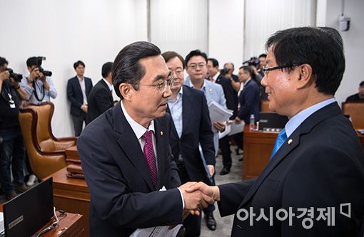 [아시아경제 윤동주 기자] 31일 경대수 자유한국당 인사청문위 간사가 이낙연 총리 후보자 임명동의에 관한 인사청문 보고서 채택에 반대하며 회의장을 나가는 중 윤후덕 더불어민주당 인사청문위 간사와 악수를 나누고 있다.윤동주 기자 doso7@asiae.co.kr<ⓒ세계를 보는 창 경제를 보는 눈, 아시아경제(www.asiae.co.kr) 무단전재 배포금지>