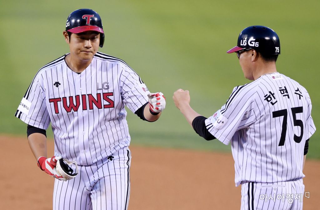 [아시아경제 김현민 기자]프로야구 넥센 히어로즈와 LG 트윈스의 2017 KBO리그 경기가 31일 잠실구장에서 열렸다. 4회말 무사 1루에서 LG 김재율이 우전 안타를 치고 한혁수 코치와 하이파이브하고 있다. 김현민 기자 kimhyun81@asiae.co.kr<ⓒ세계를 보는 창 경제를 보는 눈, 아시아경제(www.asiae.co.kr) 무단전재 배포금지>