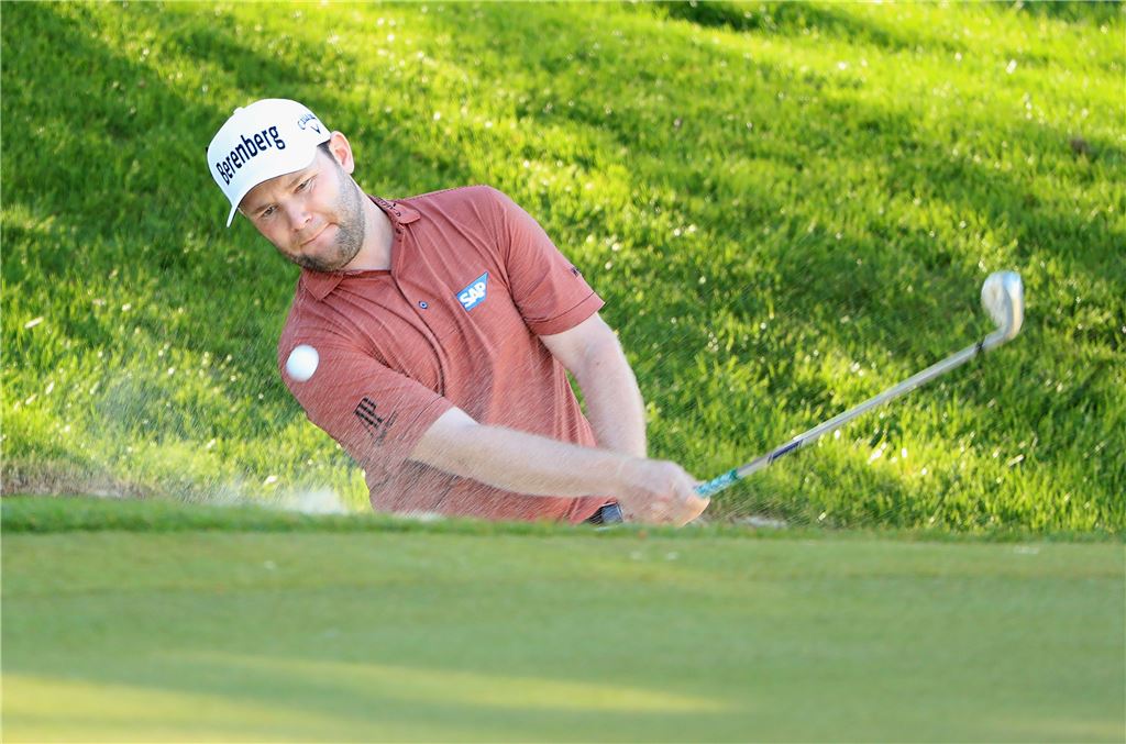 브랜든 그레이스 BMW PGA챔피언십 첫날 18번홀에서 벙커 샷을 하고 있다.
