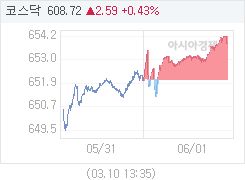2017년 06월 01일 코스닥 지수는 1.79p (0.27%) 상승한 653.83로 마감했습니다.금일 (3시10분 기준) 코스닥 주요 상승 종목은 갑을메탈,미투온,티비씨이며, 코스닥 주요 하락 종목은 바이넥스,남화토건,동성화인텍입니다.아경봇 기자 r2@asiae.co.kr<ⓒ세계를 보는 창 경제를 보는 눈, 아시아경제(www.asiae.co.kr) 무단전재 배포금지>