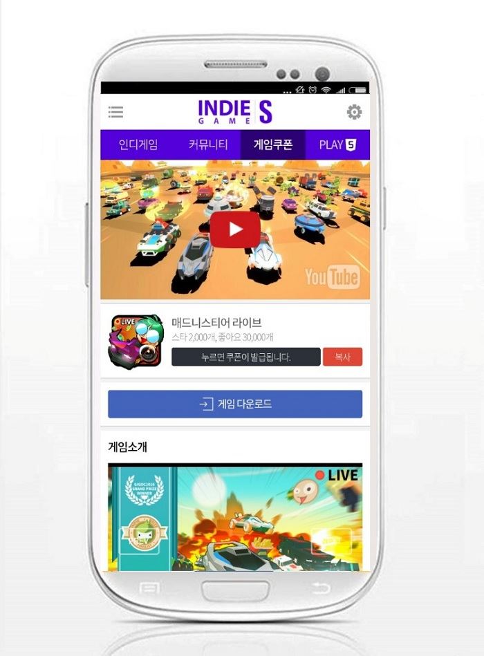이번에 쿠폰이 추가된 게임은 모바일 캐주얼 레이싱 게임 ‘매드니스티어 라이브’로 별다른 미션 없이 쿠폰 발급 신청만 해도 ‘스타 2천 개’, ‘좋아요 3만 개’를 제공한다.‘매드니스티어 라이브’는 개성 강한 주인공이 자동차 운전을 방송 소재로 활용해 유명한 BJ가 되는 스토리를 그린 모바일 캐주얼 레이싱 게임으로 2016년 ‘글로벌 인디 게임 제작 경진대회’에서 일반부 제작부문 대상을 수상한 바 있다. 남녀노소 쉽게 즐길 수 있는 간단한 조작 방식과 다양한 차량들의 화려한 스킬이 주요 특징이며, 세계 수많은 BJ들과의 랭킹 경쟁을 비롯해 방송 스튜디오 꾸미기, 경찰과의 끈질긴 추격전 등 다채로운 콘텐츠를 제공하고 있다.‘인디게임S’는 모바일게임 1위 커뮤니티 ‘헝그리앱’이 인디게임 간 상생 도모를 통한 활성화 지원과 유저와 개발사를 직접 연결하는 가교 역할을 하고자 마련한 서비스로 인디 개발사와 인디게임을 사랑하는 유저를 고루 만족시킬 수 있는 유일무이한 인디게임 종합 어플이다. 인디게임 순위와 신규게임 정보, 게임 소개 및 다운로드 링크를 안내하는 ‘인디게임’, 게임 관련 내용을 포함해 다양한 주제로 다른 유저들과 교류할 수 있는 ‘커뮤니티’, 쉽게 구할 수 없는 인디게임들의 쿠폰을 획득할 수 있는 ‘게임쿠폰’, 다운로드 없이 바로 게임을 즐길 수 있는 ‘PLAY5’ 등으로 구성되어 있다.디지털뉴스본부 온라인이슈팀 issue@asiae.co.kr<ⓒ세계를 보는 창 경제를 보는 눈, 아시아경제(www.asiae.co.kr) 무단전재 배포금지>