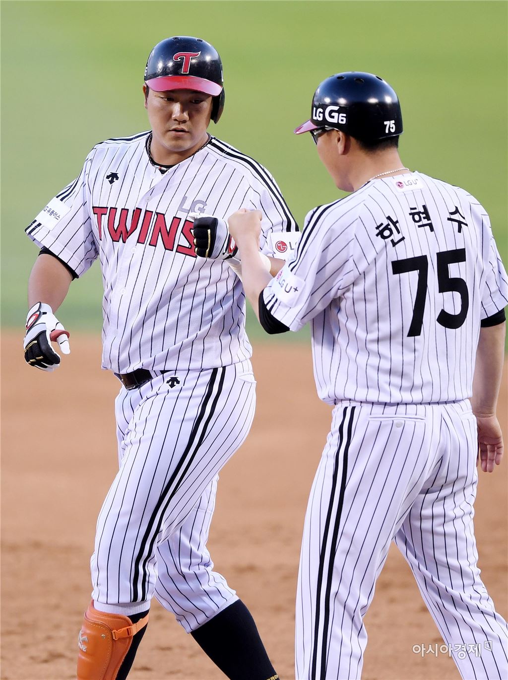 [아시아경제 김현민 기자]프로야구 넥센 히어로즈와 LG 트윈스의 2017 KBO리그 경기가 1일 잠실구장에서 열렸다. 4회말 2사 1루에서 LG 조윤준이 우전 안타를 치고 출루한 뒤 한혁수 코치와 하이파이브하고 있다. 김현민 기자 kimhyun81@asiae.co.kr<ⓒ세계를 보는 창 경제를 보는 눈, 아시아경제(www.asiae.co.kr) 무단전재 배포금지>