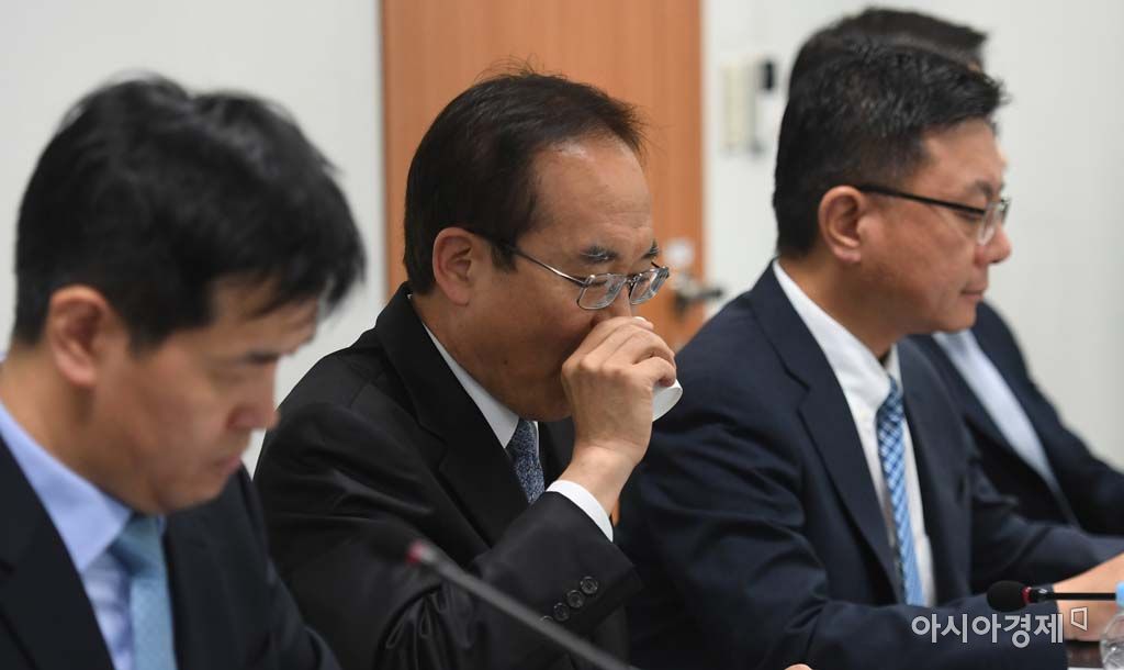 [아시아경제 백소아 기자] 김준경 한국개발원장(왼쪽 두번째)이 2일 서울 종로구 통의동 국정기획자문위원회에서 열린 한국개발원(KDI) 업무보고에서 물을 마시고 있다.백소아 기자 sharp2046@asiae.co.kr<ⓒ세계를 보는 창 경제를 보는 눈, 아시아경제(www.asiae.co.kr) 무단전재 배포금지>