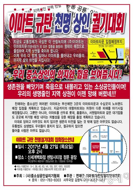 노브랜드 매장 인천 금곡점 입점 예정지는 인근 아파트 단지 입구에서 10년 이상 영업한 슈퍼마켓 길 건너편이었다. 양 매장의 판매 품목 상당수가 겹친다. 가격 경쟁력은 노브랜드 매장이 훨씬 높아 고객 싹쓸이 가능성이 제기됐다. 광주 치평점 출점 계획이 알려진 뒤에는 비슷한 이유로 지역 상인과 기초의회 의원들이 반대 성명을 냈다. 김국환 광주광역시수퍼마켓협동조합 이사장은 "우리 조합은 노브랜드 매장 개설 예고를 확인하자마자 기자회견을 열고 사업조정제도 접수 준비를 하는 등 강력하게 반발했다"며 "광주 서구 의회에서도 입점 철회 요구 공문을 보내는 등 노력한 끝에 지난달 19일 이마트가 노브랜드 개설 예고를 철회했다"고 전했다.중소상공인살리기협회가 지난달 27일 연 이마트 규탄 집회의 포스터(아시아경제 DB)