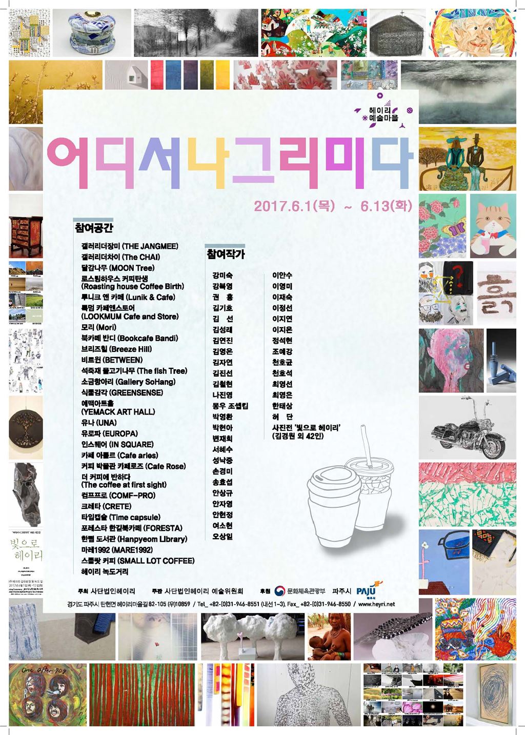 [아시아경제 김세영 기자] 제 1회 ‘어디서나그리미다’ 기획 전시가 1일부터 13일까지 헤이리 예술마을(경기도 파주시 탄현면) 내 위치한 스물여덟 곳 카페 공간 및 녹도거리에서 열린다. ‘어디서나그리미다’ 기획전은 사단법인헤이리 예술위원회가 주최하고 문화체육관광부, 파주시가 후원하는 문화마을 조성 지원사업의 일환이다. 전시는 어렵게 느껴지는 미술관, 박물관, 갤러리 방문의 문턱을 낮춰 누가, 언제, 어디서든 예술작품을 접할 수 있도록 기회를 제공한다. 신인들을 비롯한 국내 유수 작가(김경원 외 42인)들이 대거 참여한다. 참여공간은 갤러리더장미 등을 비롯해 총 스물일곱 곳이다. 이번 전시는 헤이리 예술마을 곳곳에서 다채롭게 열린다. 방문객은 문화예술 공간으로 변신한 카페에서 회화, 압화, 염색, 도예, 사진 등 다양한 작품을 만날 수 있다. 작가들은 자연스럽게 관람객과 소통할 수 있는 자리를 마련한다. 헤이리 예술마을을 찾는 이들에게 커피 한 잔의 여유와 현대미술 관람의 기회를 선사할 이번 전시는 문화예술을 향유하고 전시의 관람 폭을 넓혀줄 것이다. 문의는 031-946-8553.김세영 기자 ksy1236@asiae.co.kr<ⓒ세계를 보는 창 경제를 보는 눈, 아시아경제(www.asiae.co.kr) 무단전재 배포금지>