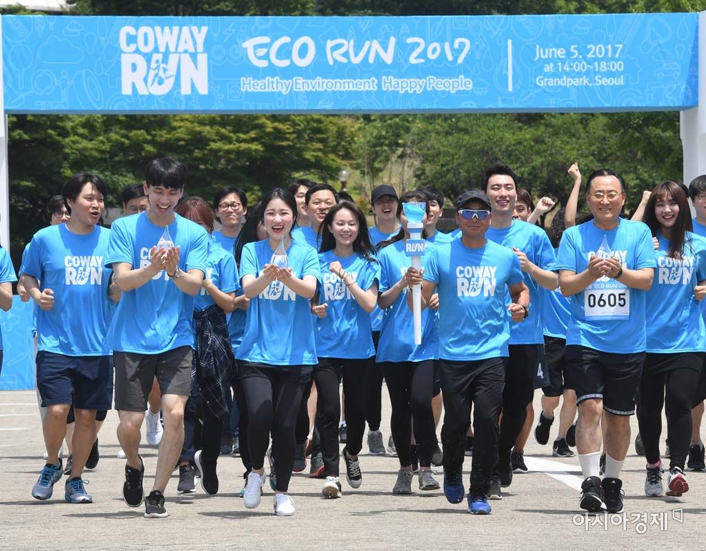 [아시아경제 백소아 기자] 5일 경기도 과천시 서울대공원에서 열린 Coway Run(코웨이 런)에서 이해선 코웨이 대표이사와 이봉주 마라토너를 비롯한 직원들이 소중한 물 안고 달리기 퍼포먼스를 하고 있다.백소아 기자 sharp2046@asiae.co.kr<ⓒ세계를 보는 창 경제를 보는 눈, 아시아경제(www.asiae.co.kr) 무단전재 배포금지>